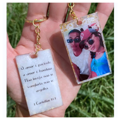 Nosso chaveiro retangular personalizado é feito com resina epóxi de alta qualidade, garantindo brilho e durabilidade.