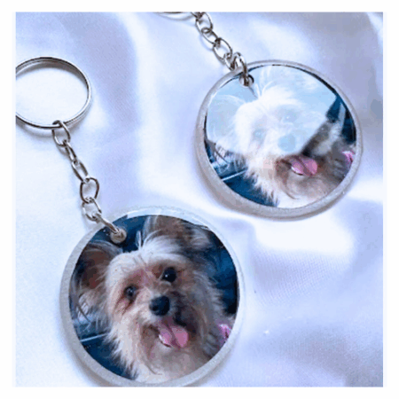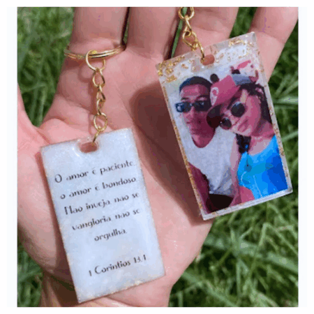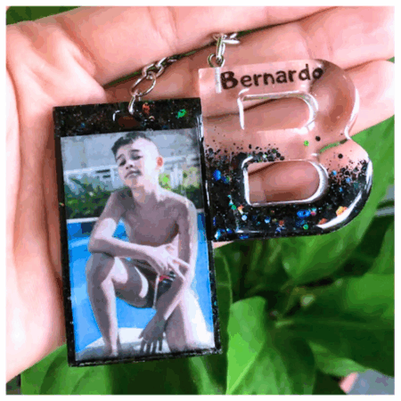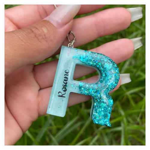 O chaveiro letra inicial é feito artesanalmente com resina epóxi, podendo ser personalizado nas cores e efeitos que você escolher — com glitter, pigmentos e outros detalhes decorativos.