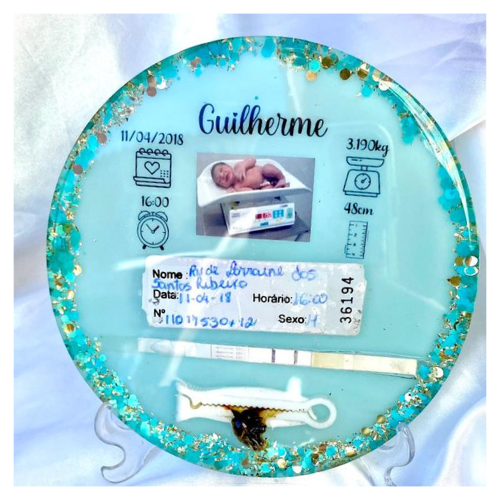 A Eternização Materna Redonda tem 12cm e é feito com resina epóxi, que preserva os itens de forma duradoura e com brilho impecável.