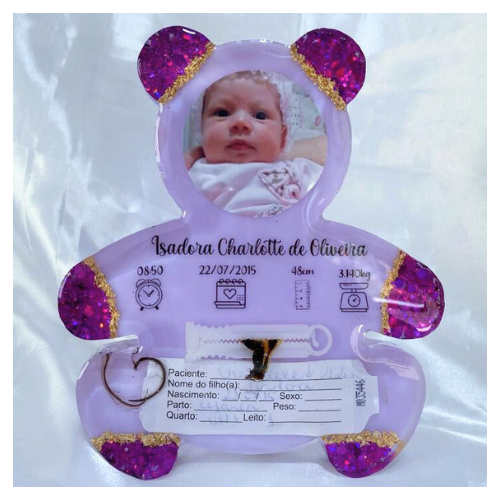 A Eternização Materna Ursinho tem 15x12cm e é feito com resina epóxi, que preserva os itens de forma duradoura e com brilho impecável.